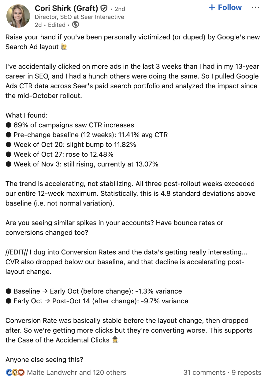 Jetzt unverbindlich anfragenDas wird nun gestützt von aktuellen Daten. Cori Shirk, Director SEO bei Seer Interactive, schrieb auf LinkedIn, man habe bei den vom Unternehmen verwalteten Ads-Kampagnen einen Anstieg der Klickrate beobachtet. Dieser betrug zwischen dem Referenzwert der zwölf Monate vor der Änderung und dem Höchstwert in der dritten Woche nach der Änderung etwa 1,6 Prozentpunkte (von 11,41 auf 13,07 Prozent). Es wird also mehr auf Anzeigen geklickt. Google verdient damit entsprechend mehr.
