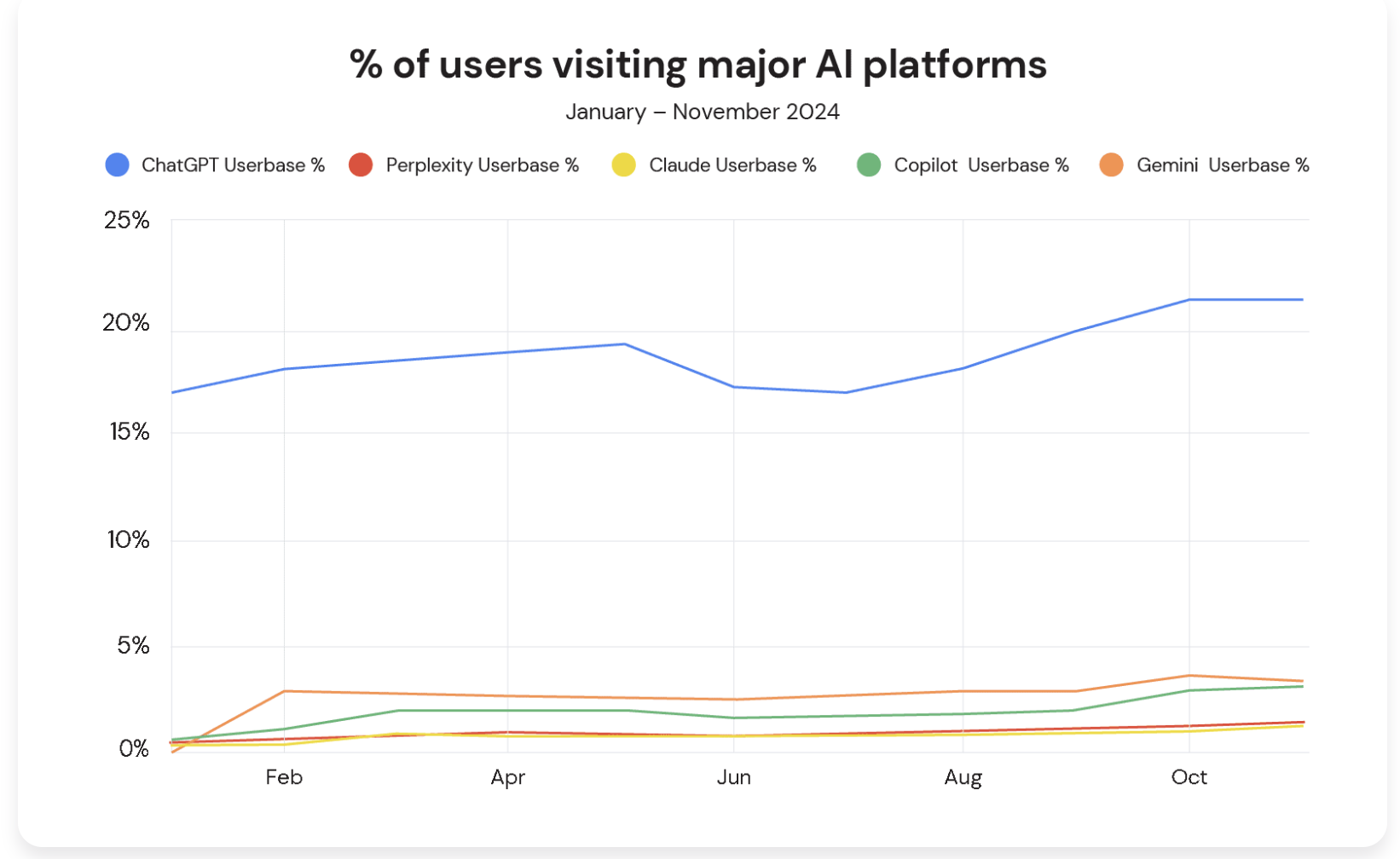 Und was ist mit den KI-Suchen als Konkurrenz? Hier scheint aktuell nur ChatGPT eine Rolle zu spielen, wenn man sich den Anteil der Nutzerinnen und Nutzer ansieht, die solche Tools verwenden. Hier lag ChatGPT zuletzt über 20 Prozent. Weit abgeschlagen sind Google Gemini, Microsoft Copilot, Claude und Perplexity (alle unterhalb von fünf Prozent).