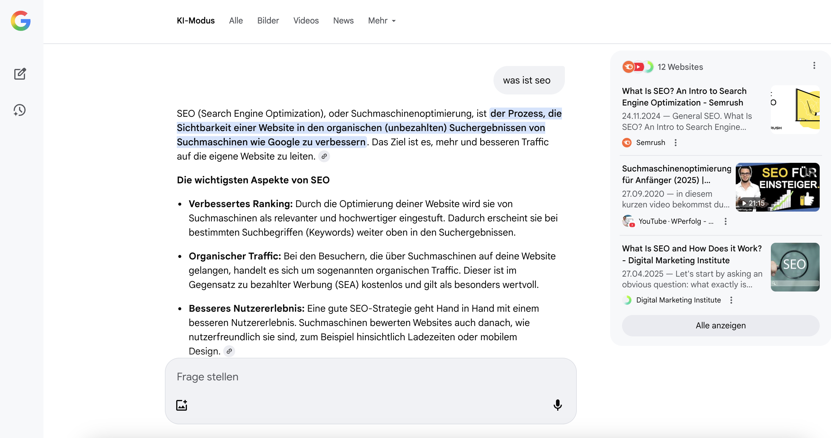 Mit dem heutigen Tag dürfte sich in der Suche und damit auch in der SEO einiges ändern. Der Grund: Google hat den AI Mode (hierzulande "KI-Modus" genannt), jetzt wirklich ausgerollt. Nach der Ankündigung des Rollouts in weiteren Ländern letzte Woche, die unter anderem die EU und auch die Schweiz betroffen hatte, verging fast eine weitere Woche.
