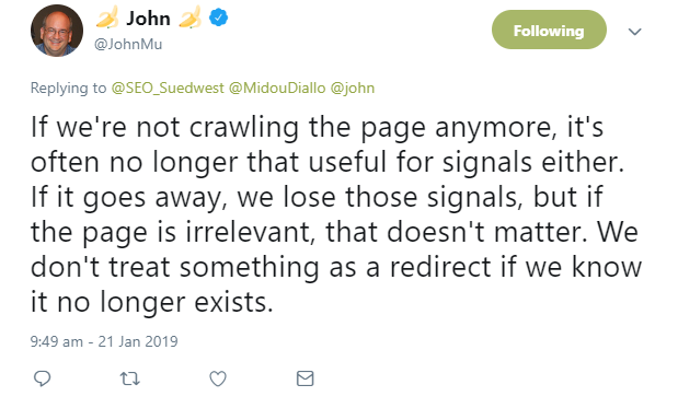Das bedeutet: Wenn Redirects entfernt werden, geht Google davon aus, dass diese nicht mehr benötigt werden und ignoriert die entsprechenden Signale. Gibt es zu diesem Zeitpunkt also noch Links auf die alten URLs, so gehen diese Signale verloren. Das bestätigte Johannes Müller in einem späteren Tweet: