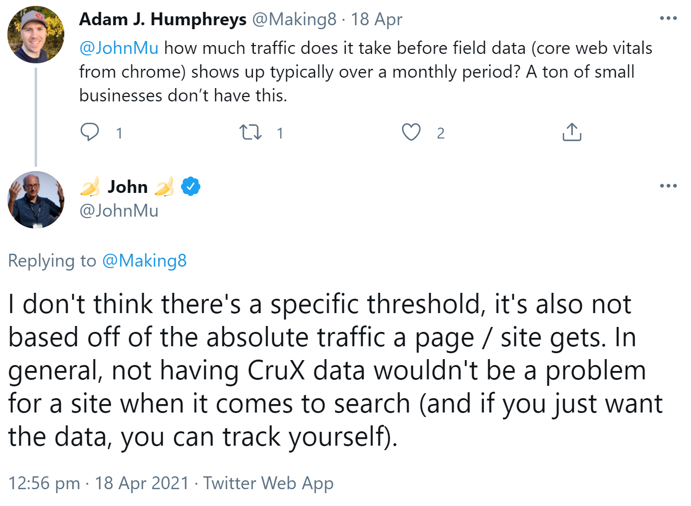 Ob Google für eine Webseite Felddaten zu den Core Web Vitals anzeigt, hängt laut John Müller von Google nicht vom absoluten Traffic der Seite ab.